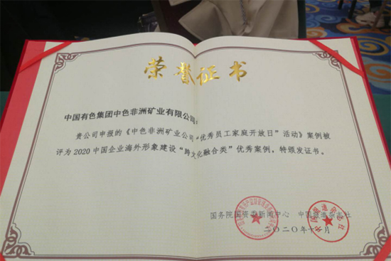 11月3日,由中央宣传部、国务院国资委、全国工商联指导,中国外文局主办的2020·中国企业海外形象高峰论坛在北京举办。论坛上,正式揭晓了“2020中国企业海外形象建设优秀案例征集活动”的评选结果。中国有色集团中色非矿公司《“优秀员工家庭开放日”活动》案例被评为2020中国企业海外形象建设“跨文化融合类优秀案例”。
