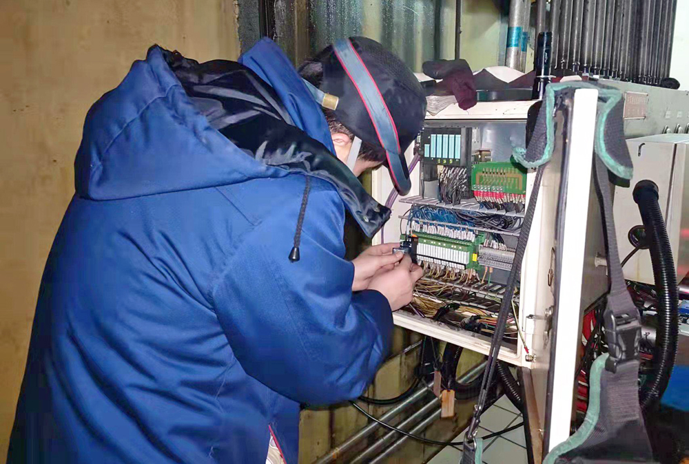2月21日,铍铜分厂四辊精轧机3M除油辊不上升,导致设备停机,影响正常生产。中色新材机电维修分厂电气技术人员奔赴车间,对故障点进行检查维修,在确定故障原因后,得知库房没有备件时,电气技术人员钱吉运根据设备原理结合电气图纸设计改造方案找电气元件,利用两个半小时完成3M除油辊控制系统改造工作,经过试运行,3M除油辊恢复正常运转,确保分厂生产稳定运行。(文/摄 赵志喜)