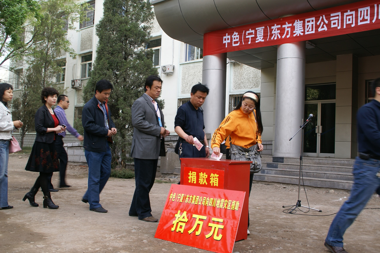 5月14日早晨,集团公司办公大楼前爱心涌动。“中色(宁夏)东方集团为四川地震灾区捐款仪式”的横幅前,排着长队的干部职工纷纷解囊,将饱含爱心的捐款放进了捐款箱。