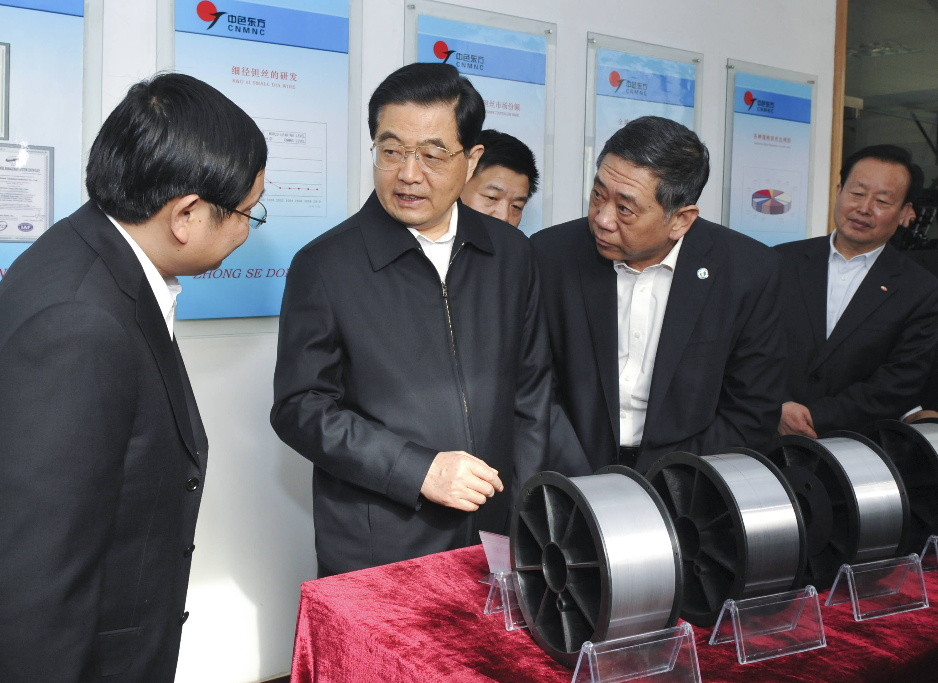 在中国有色集团总经理罗涛、中色东方董事长张创奇、总经理钟景明的陪同下,胡锦涛总书记健步走进中色东方展厅。在一幅幅记录公司发展历程的照片前,在一件件展示着企业自主创新的产品样品前,在一个个见证了公司为国家国防军工事业做出重要贡献的荣誉证书和奖牌、奖杯前,胡锦涛总书记驻足良久,啧啧称赞。当看到1995年6月26日自己第一次视察中色东方的照片时,胡锦涛总书记倍感亲切,感慨于中色东方集团近年来的巨大发展变化。总书记十分感兴趣地问,“你们的矿石原料从哪里来?”“钽粉的技术水平是怎么衡量的?”当得知该公司仅用8年时间便将主导产品钽粉、钽丝与世界同行存在的20年差距缩短到不相上下,成为国内最大的钽、铌产品科研、生产企业和惟一的铍材科研生产基地,主导产品钽粉、钽丝的销售量分别居世界第二和第一位时,总书记连连点头称赞。当听到罗涛总经理介绍:“中色东方技术人员所占比例很大,他们为我国钽工业的发展贡献了积极的力量,宁夏惟一的中国工程院院士何季麟同志就是杰出的代表。”总书记问道:“何院士还在不在企业?我能见到他吗?”中色东方自主研发的尖端产品超导铌腔引起了总书记的注意,该技术的研发日本用了23年,而中色东方仅用了4年时间。总书记问:“北京电子对撞机用的材料就是你们提供的吗?”在得到肯定的答复后,他微笑着点点头。