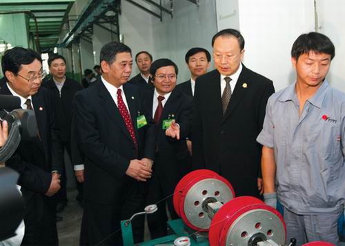 随后,杜青林来到了钽丝生产车间。在这条世界先进的钽丝生产线前,他仔细询问了钽丝生产工艺流程、用途、市场份额和销售网络。他又走到当班职工高路面前,亲切地询问:“今年多大了?”“工作多长时间了?”“三班倒还是四班倒?”“累不累?”“收入怎么样?”高路一一作了回答。