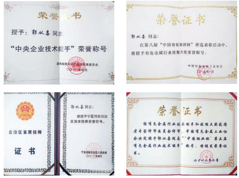 1989 年,郭从喜从宁夏机械技工学校毕业后,分配到中色(宁夏)东方集团有限公司工作,29 年来,他在工作岗位上勤动手、善钻研、乐思考,攻克了许多钽铌材料机械加工难题,研制出了一套适合钽铌加工的刀具,填充了国内 在钽铌材料机械加工中刀具几何角度不确定的这一空白,赢得了企业领导和职工的好评,并于 2012 年被自治区政府授予“宁夏回族自治区首席技师”称号。