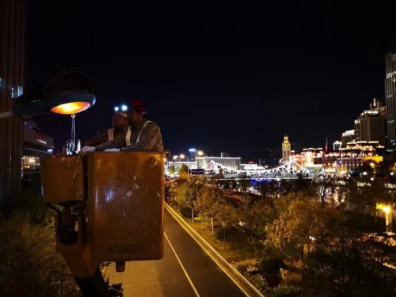 天津电力路灯公司员工在检修路灯,智慧电网大大减少了路灯故障率