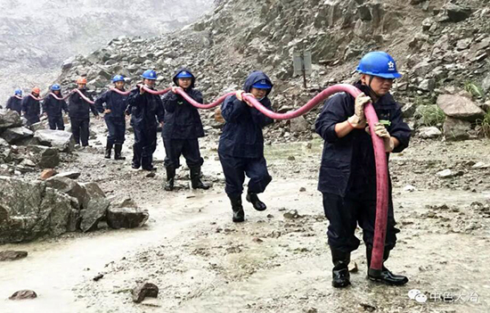 中色大冶矿山救援队派出4名抢险队员,出动1辆指挥车、1辆重型半挂牵引车,装载了2台11米扬程、功率45kw、每小时900升流量水泵、60米DN300不锈钢波纹管、2台低压控制柜以及若干辅材,于9日15时36分出发,19时到达抢险现场,全力协助地方政府安装排洪设备。截至发稿时止,4名队员仍在紧张抢险中。
