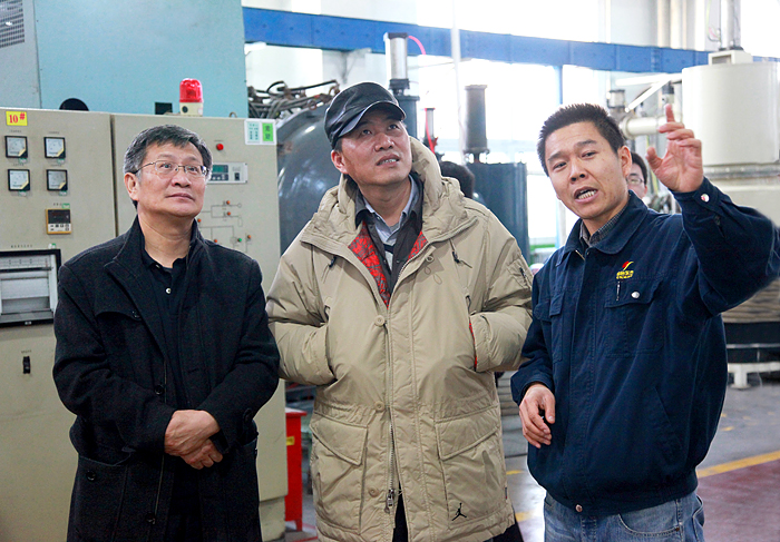武翔先后到钽铌冶金分厂、钽铌材料分厂和钽铌制品分厂,了解了钽粉、钽丝等产品的生产情况及熔炼铌扩能技改项目、极大规模集成电路用溅射靶材项目的市场前景等情况。