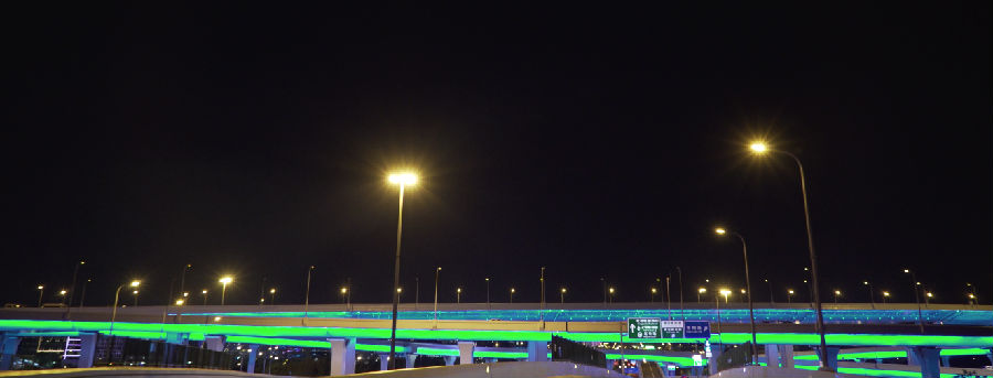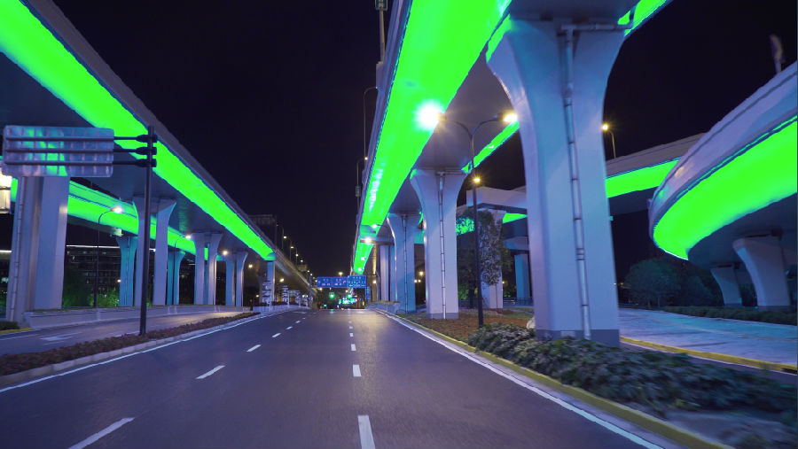 作为高架的“美容师”,作品现在已经可以“崭露头角”了。白天走在路上,“高架灰”让整座城市显得更有质感;夜幕降临,彩色的灯光镶嵌在高架桥两边,汽车风驰电掣,仿佛穿越梦幻空间。